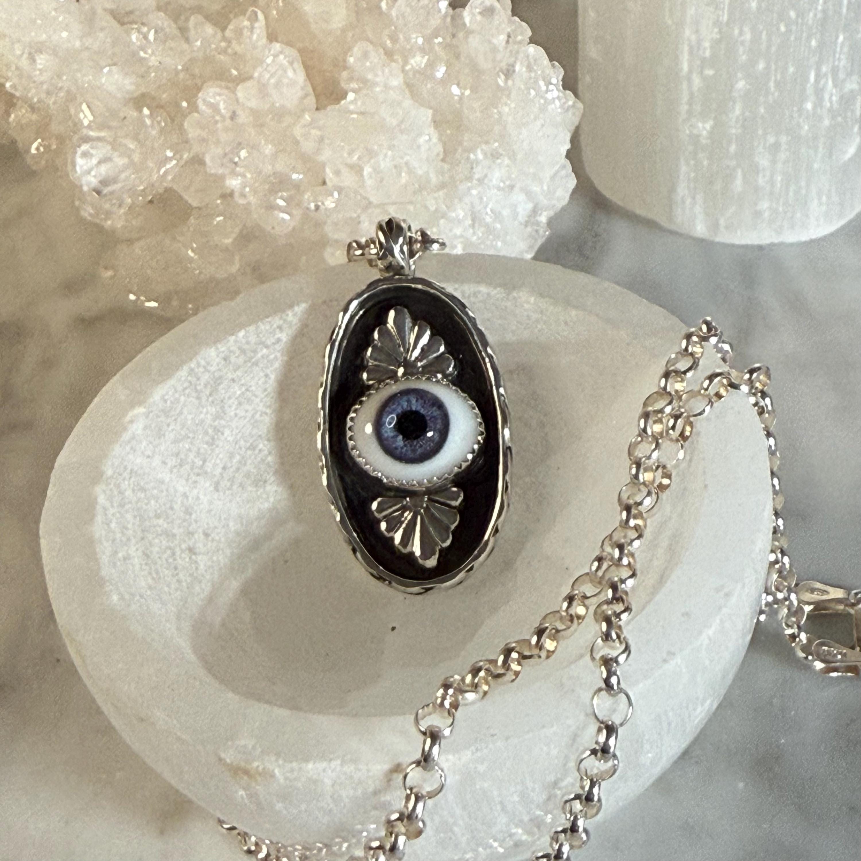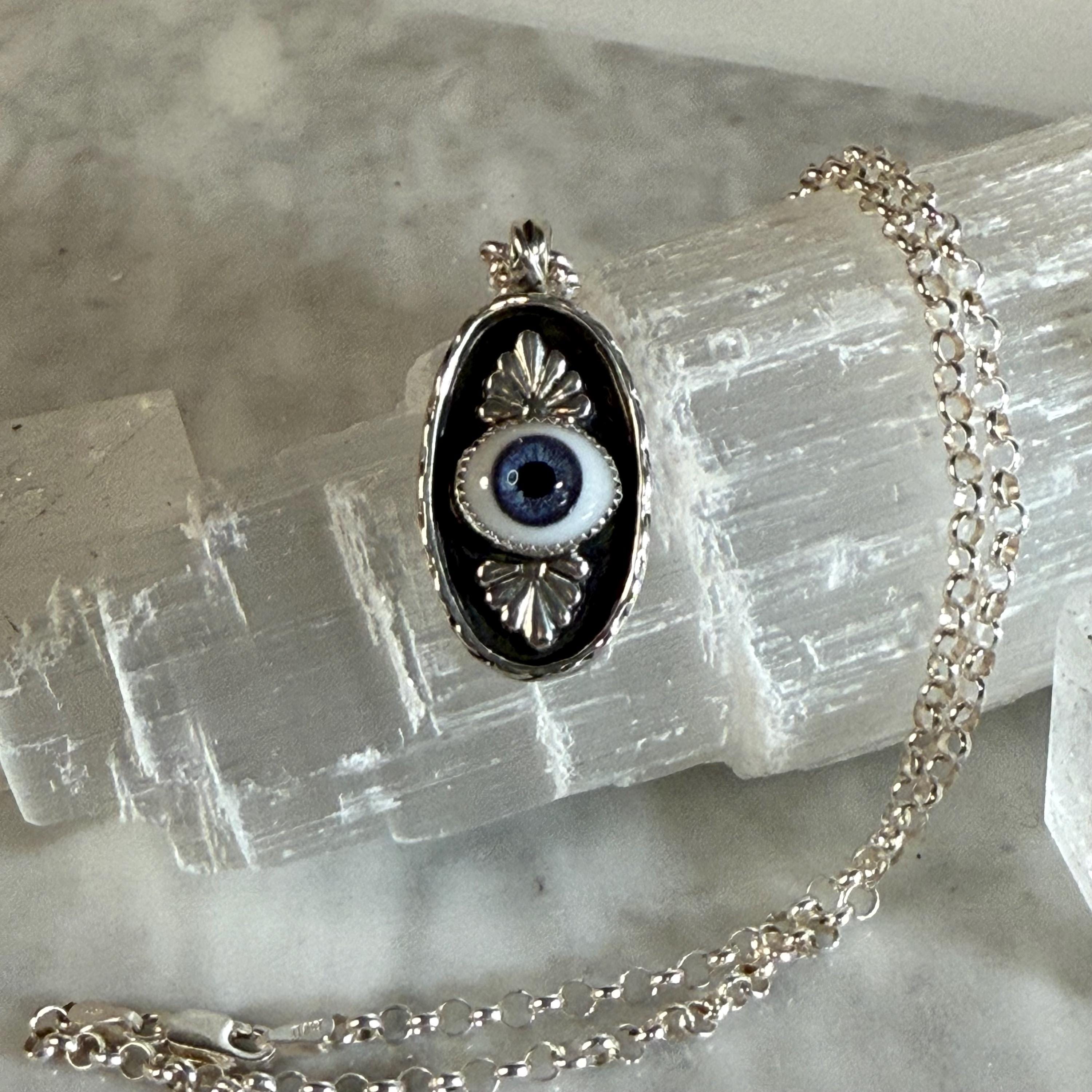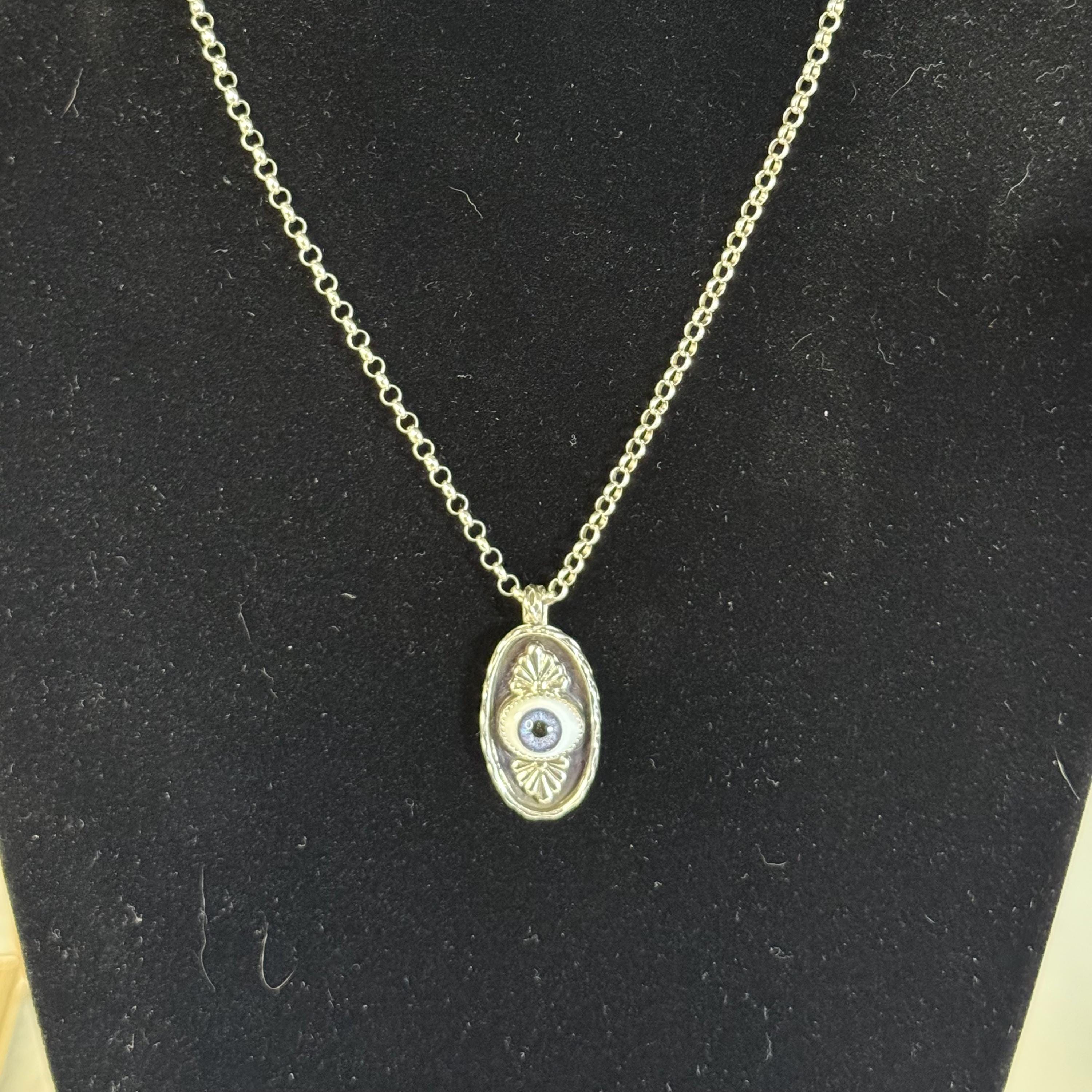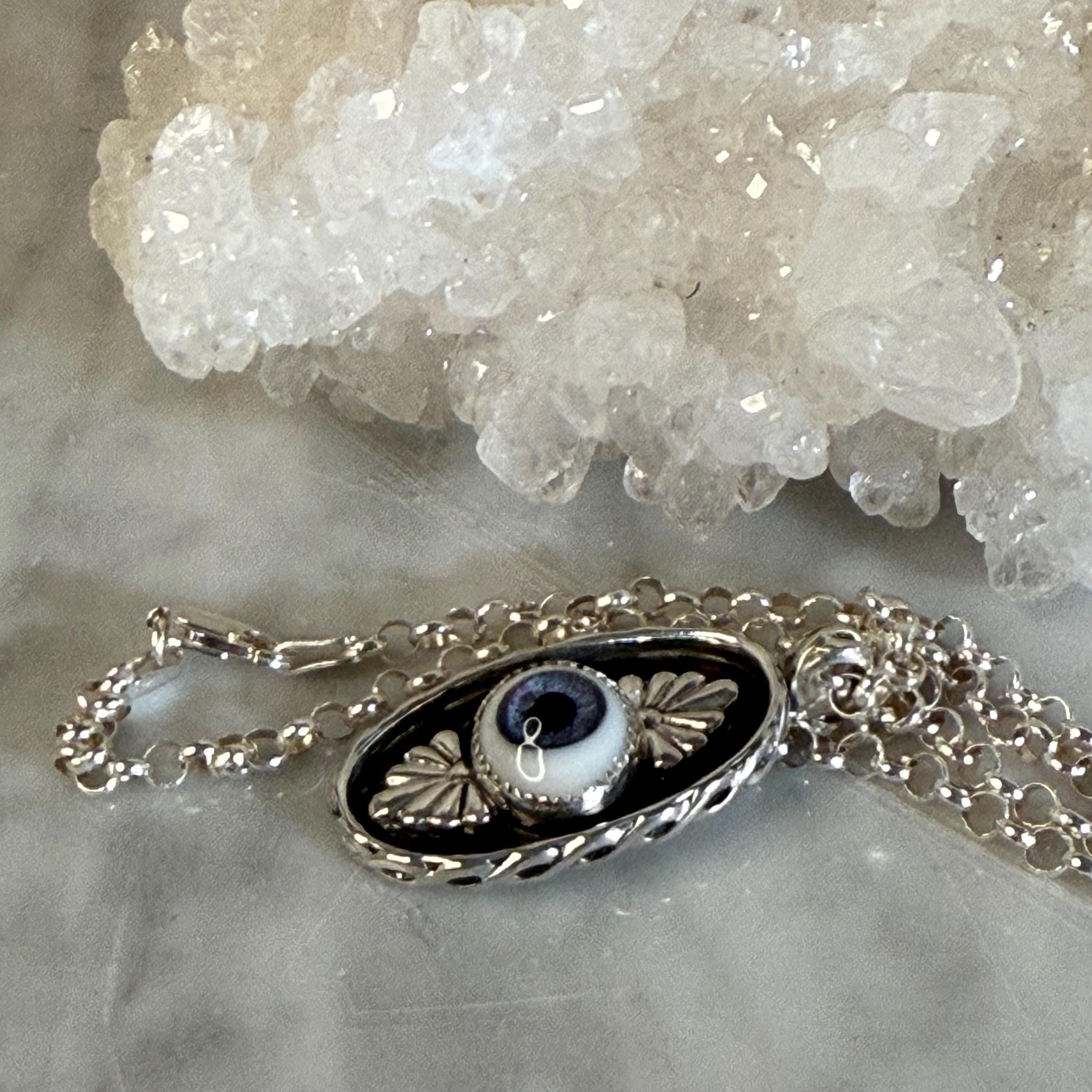 This striking sterling silver pendant features a pretty, blue glass eye set in a shadowbox frame and encircled by an infinity symbol border for eternal protection. The black background highlights both the eye and the talavera embellishments creating depth and visual intrigue. Complete with an 18" sterling silver roll chain, this artisan piece combines ancient symbolism with contemporary craftsmanship - perfect for daily wear or as a meaningful gift.