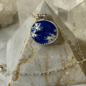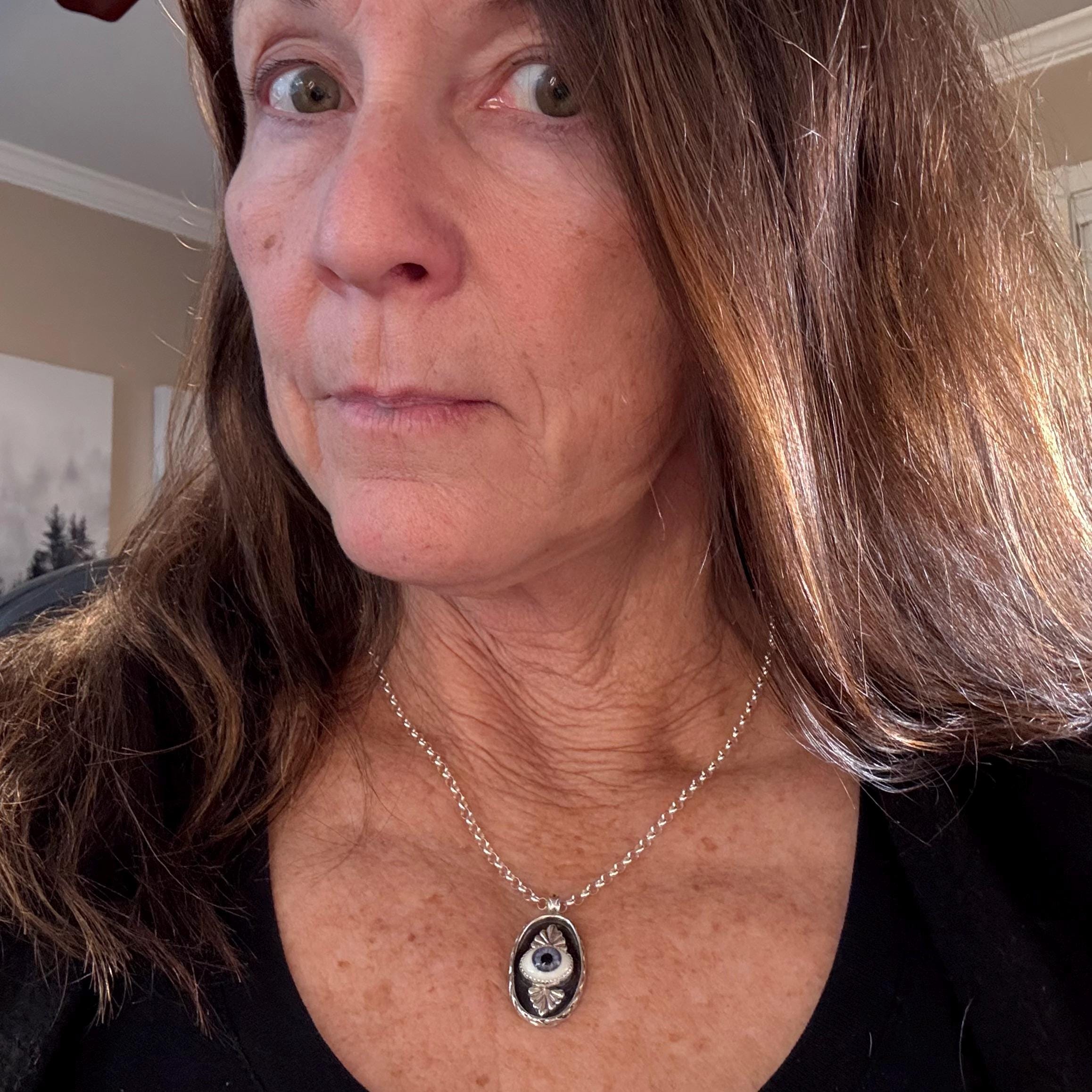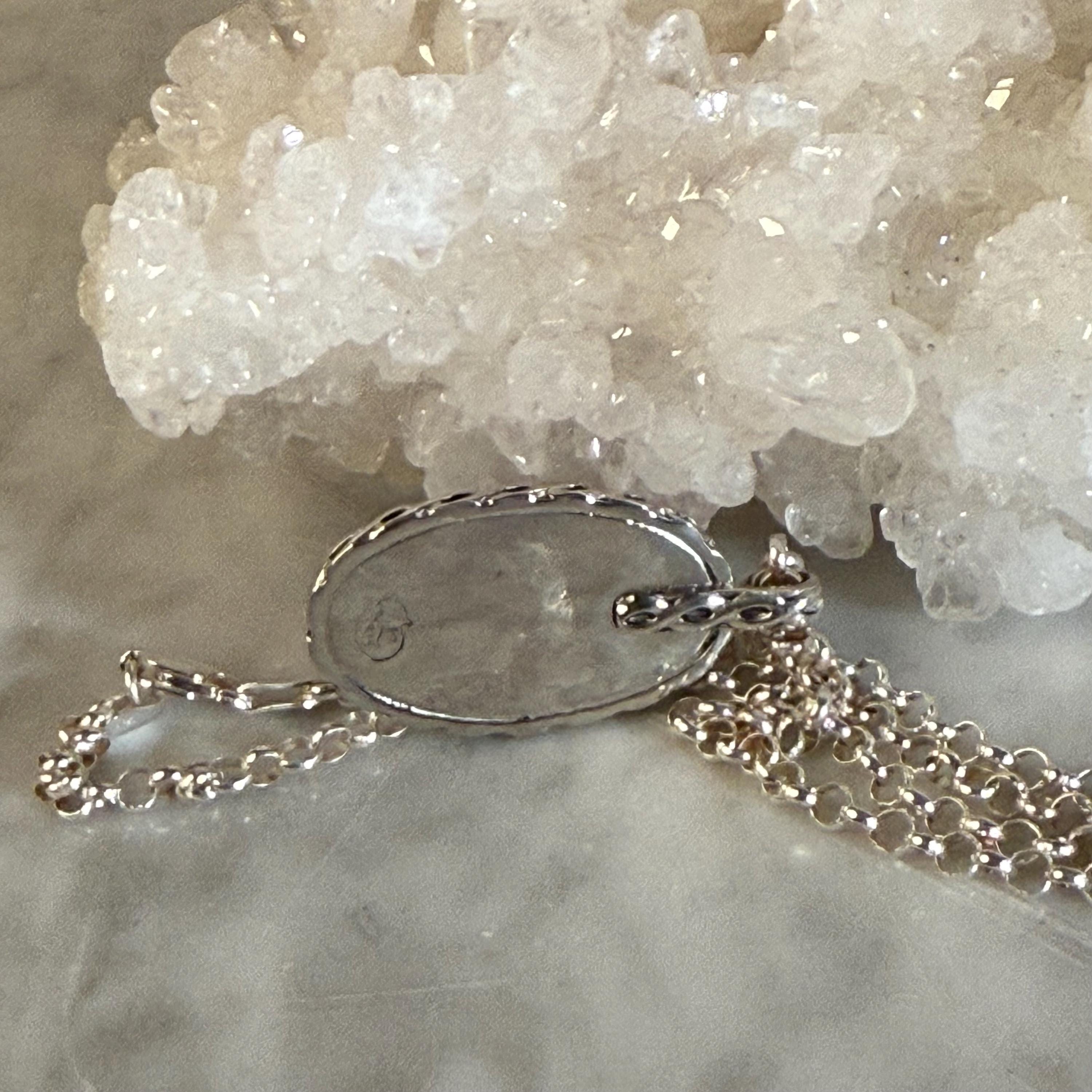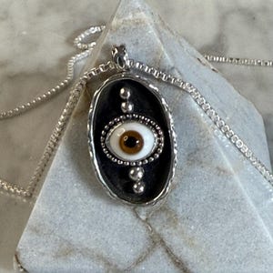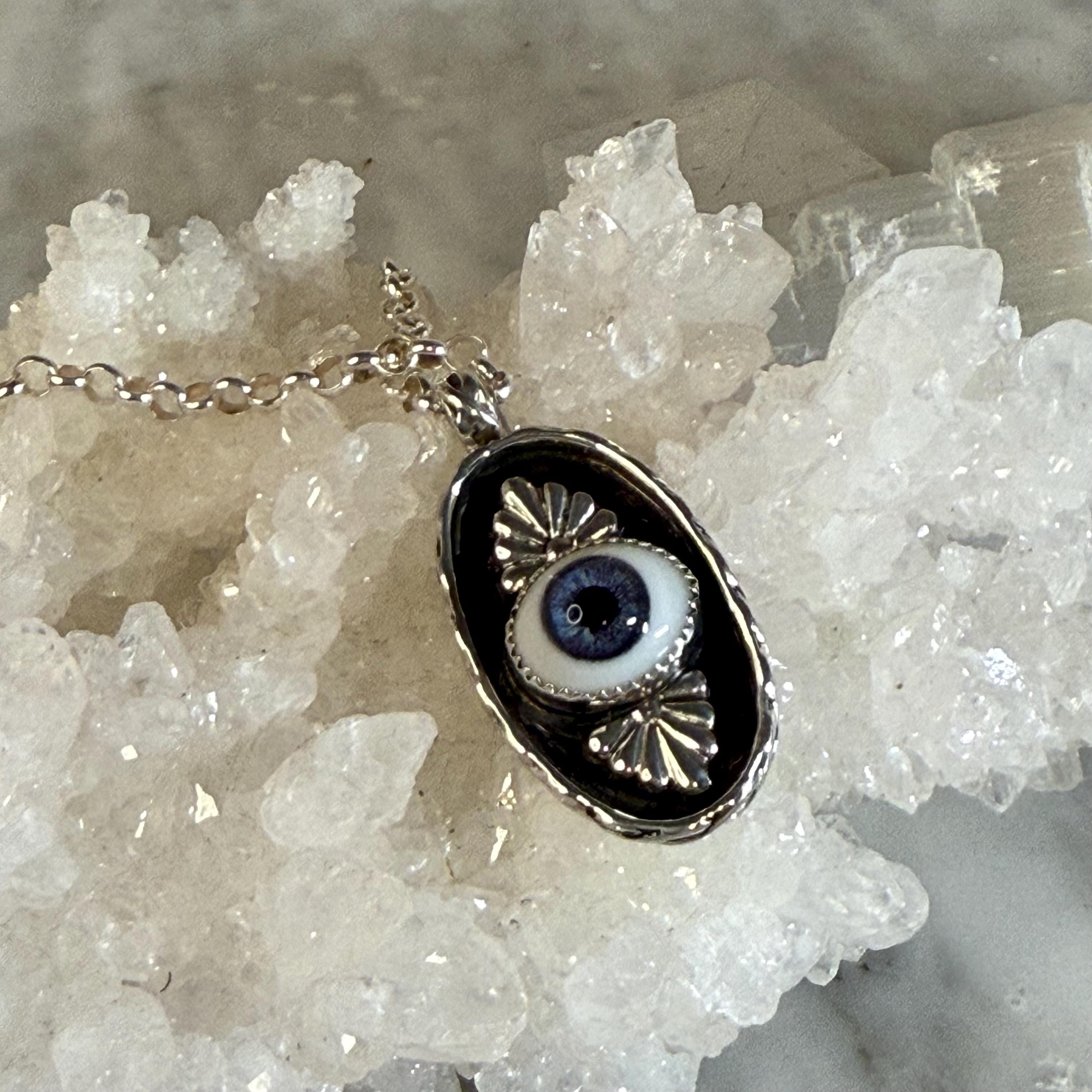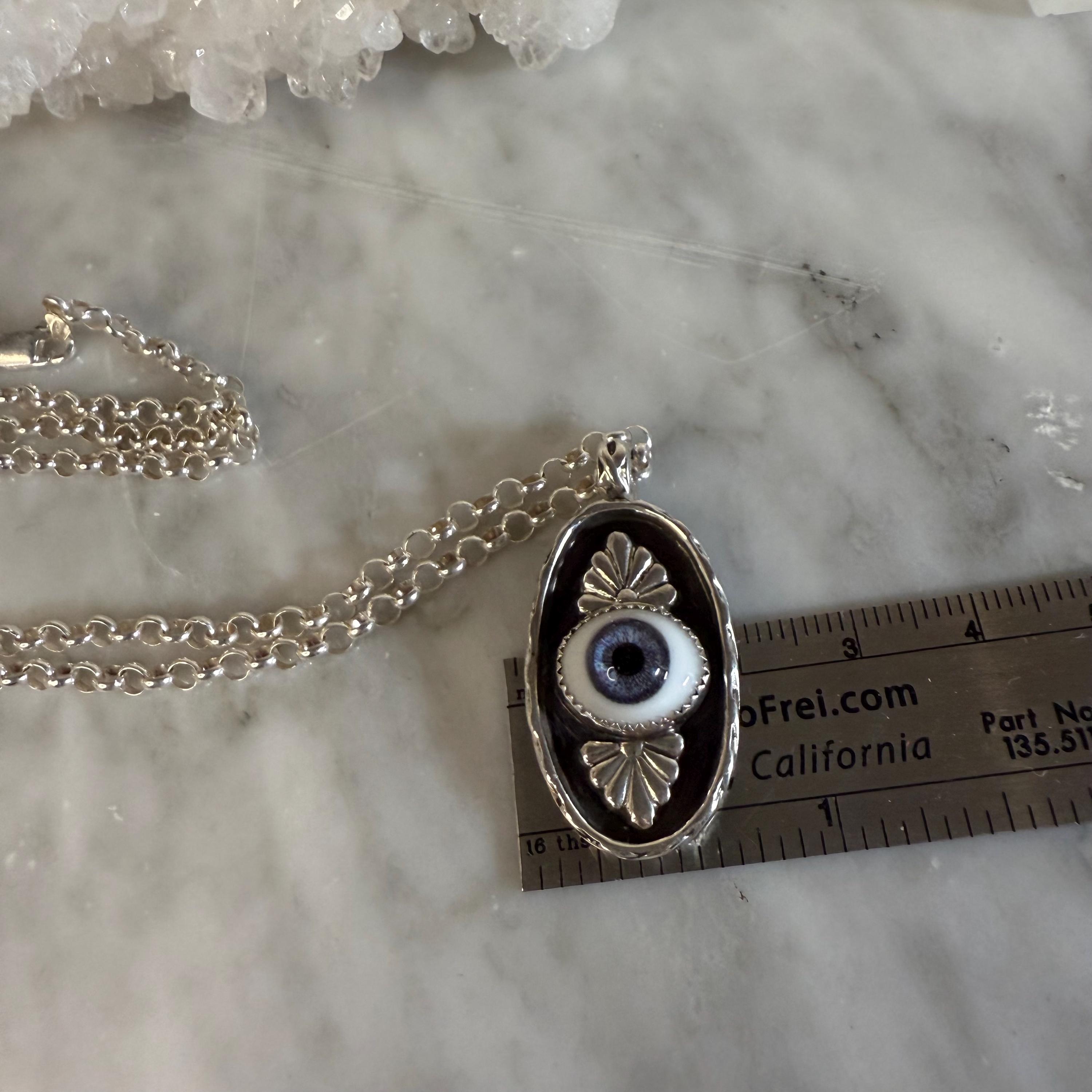 This striking sterling silver pendant features a pretty, blue glass eye set in a shadowbox frame and encircled by an infinity symbol border for eternal protection. The black background highlights both the eye and the talavera embellishments creating depth and visual intrigue. Complete with an 18" sterling silver roll chain, this artisan piece combines ancient symbolism with contemporary craftsmanship - perfect for daily wear or as a meaningful gift.